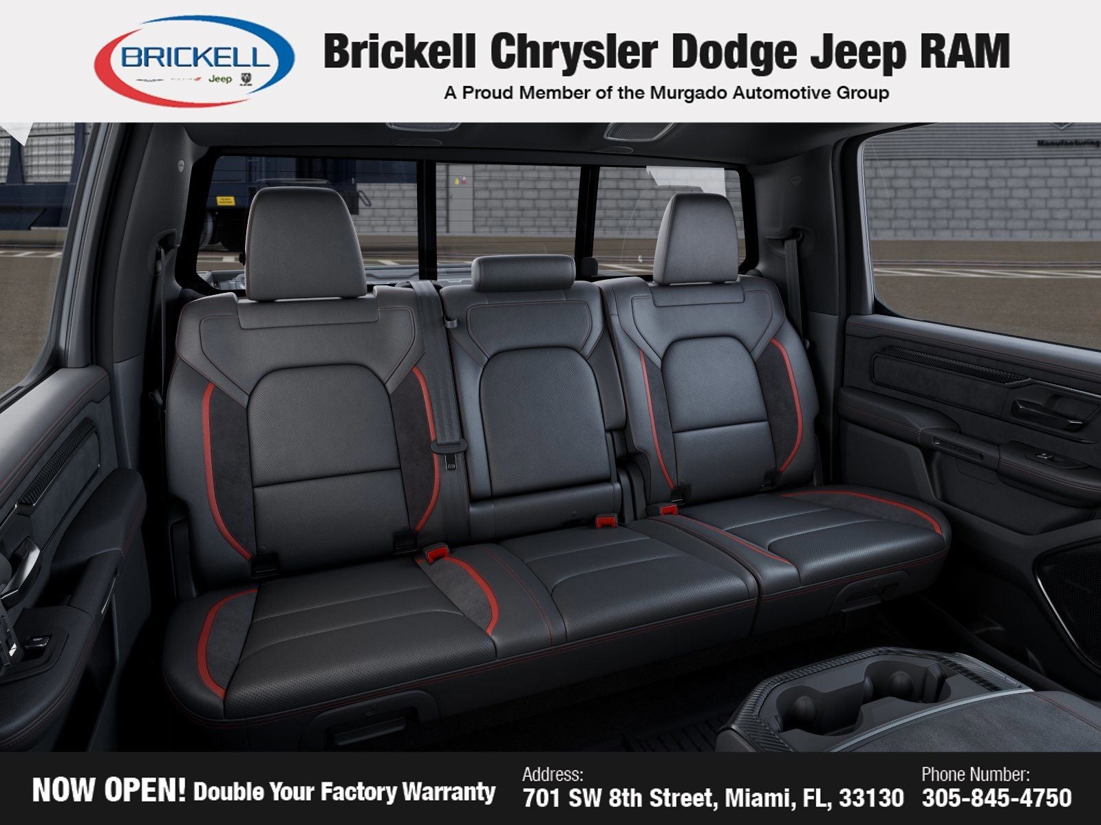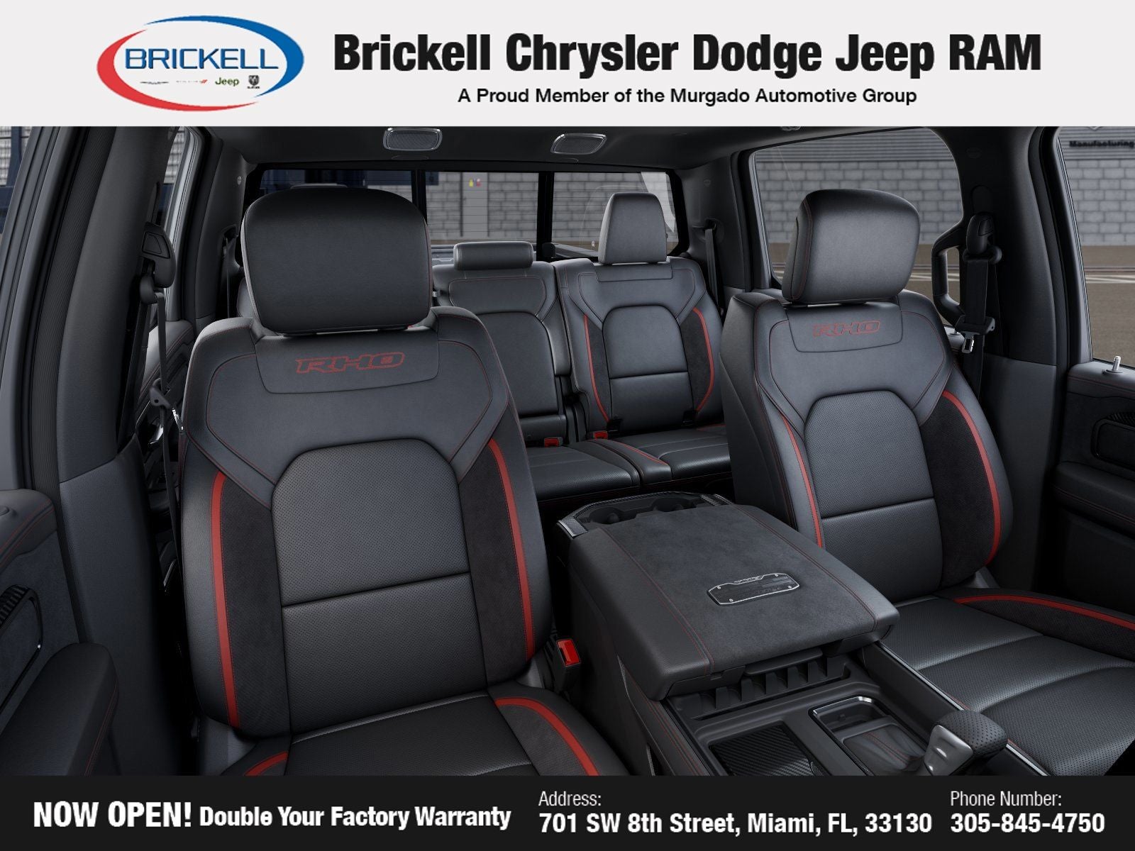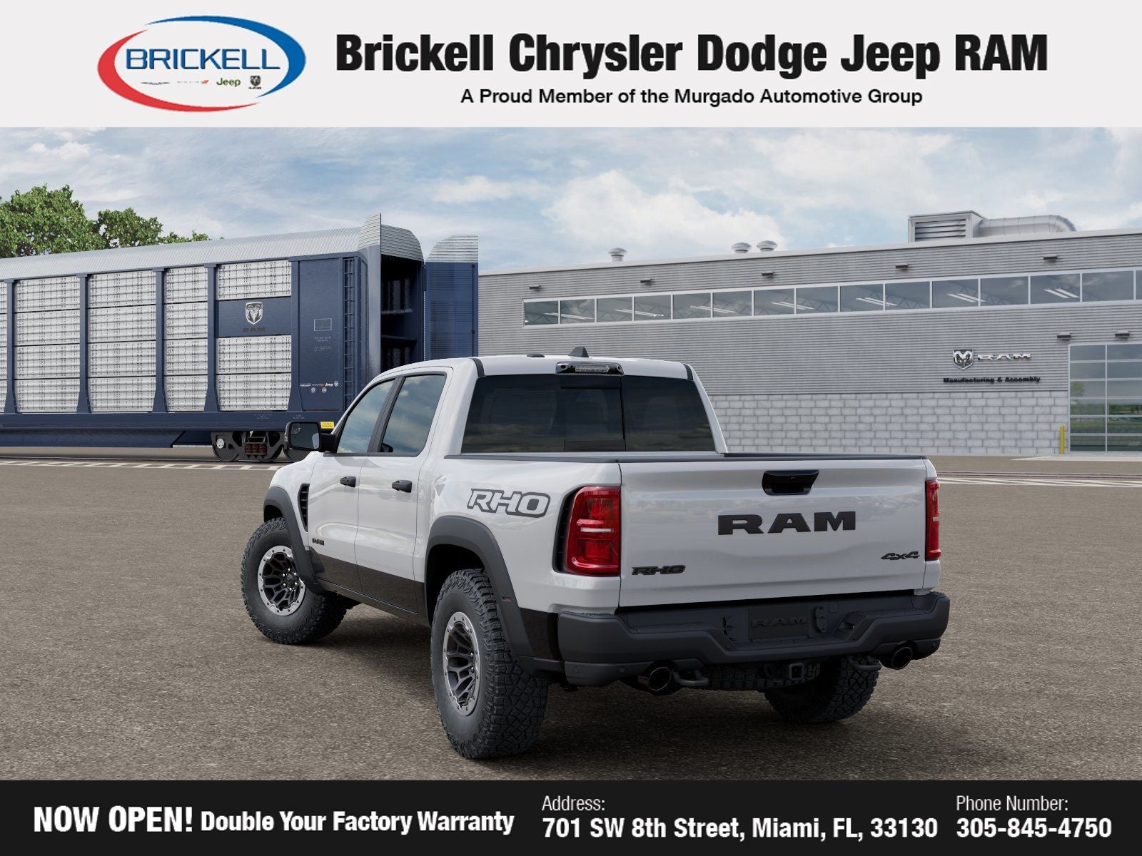 Discover Your Next Vehicle at Brickell Chrysler Dodge Jeep Ram Welcome to Brickell CDJR, where we go beyond selling cars. We double the factory powertrain warranty, giving you added peace of mind. Our dealership offers one of the largest new car inventories in the region, ensuring you find the right vehicle Prices displayed do not included our Perma-plate. Our state-of-the-art service department is the largest in the country and is open seven days a week from 7 AM to 9 PM. Visit us at 701 SW 8th St, Miami, FL 33130, or call 305-777-2800 to learn more and schedule a test drive. The displayed price includes an incentive for financing with Brickell CDJR Finance Company. Outside financing and bank drafts are not accepted. All pre-owned vehicle exports are subject to an export fee. Prices apply only to customers who live, work, or worship in Broward, Miami-Dade, Palm Beach, Monroe, Collier, Hendry, Lee, Glades, Martin, St. Lucie, Okeechobee, Manatee, Hillsborough, Osceola, or Orange County. Customers outside these counties will pay an additional $ Taxes, title, registration, and dealer fees apply. New Price! Factory MSRP: $94,155 Bright White Clearcoat 2026 Ram 1500 RHO 4WD 8-Speed Automatic 3.0L I6