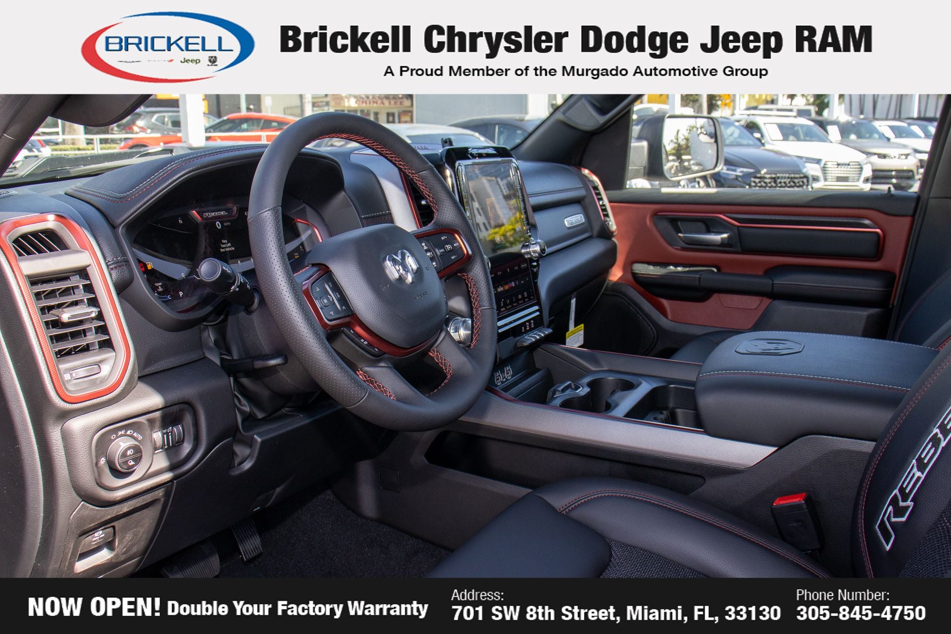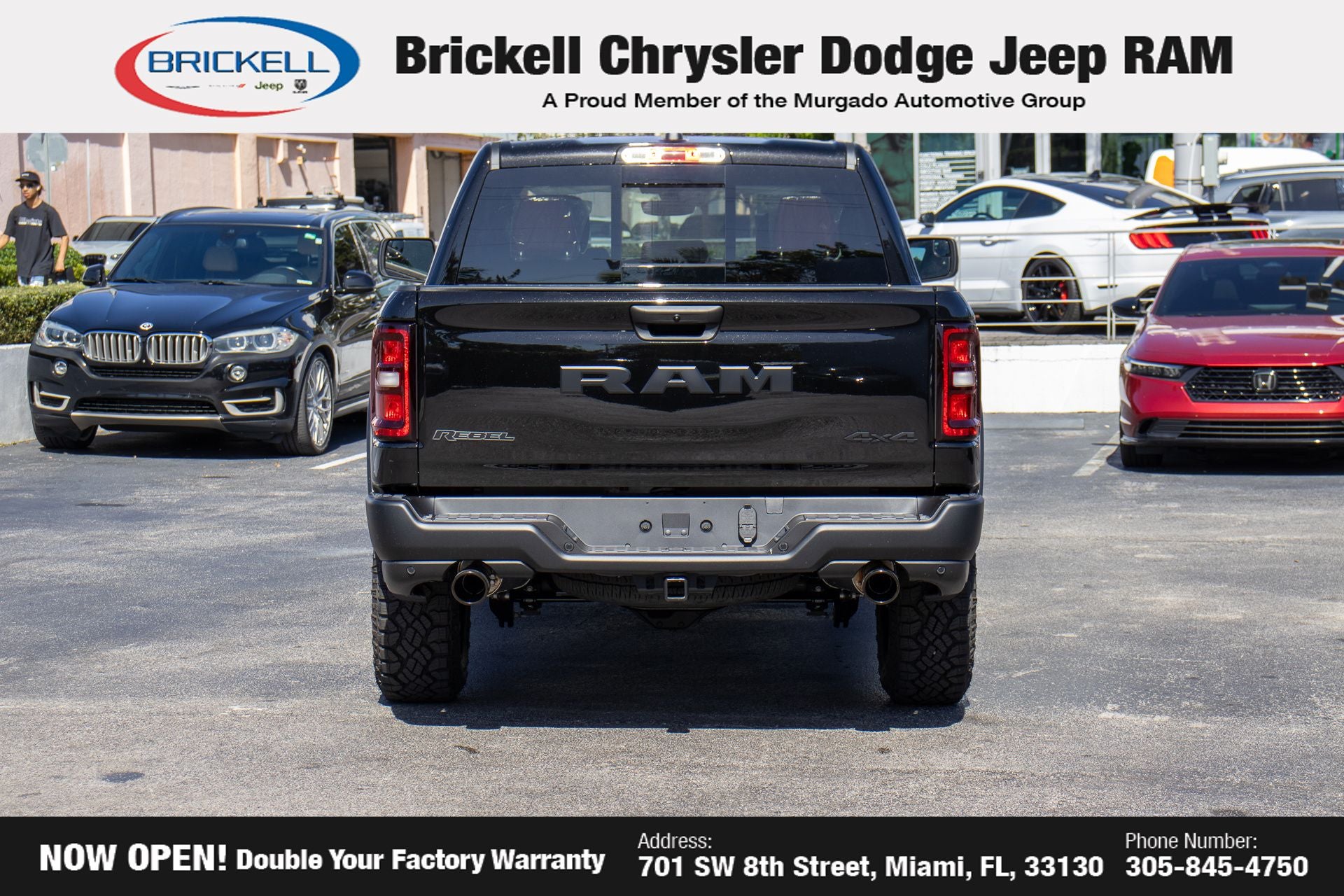 Price includes: $1000 - 2026 National Bonus Cash . Exp. 03/31/2026 $3500 - 2026 National Retail Consumer Cash . Exp. 03/31/2026 $500 - 2026 National 2026 Military Bonus Cash . Exp. 01/04/2027 Discover Your Next Vehicle at Brickell Chrysler Dodge Jeep Ram Welcome to Brickell CDJR, where we go beyond selling cars. We double the factory powertrain warranty, giving you added peace of mind. Our dealership offers one of the largest new car inventories in the region, ensuring you find the right vehicle Prices displayed do not included our Perma-plate. Our state-of-the-art service department is the largest in the country and is open seven days a week from 7 AM to 9 PM. Visit us at 701 SW 8th St, Miami, FL 33130, or call 305-777-2800 to learn more and schedule a test drive. The displayed price includes an incentive for financing with Brickell CDJR Finance Company. Outside financing and bank drafts are not accepted. All pre-owned vehicle exports are subject to an export fee. Prices apply only to customers who live, work, or worship in Broward, Miami-Dade, Palm Beach, Monroe, Collier, Hendry, Lee, Glades, Martin, St. Lucie, Okeechobee, Manatee, Hillsborough, Osceola, or Orange County. Customers outside these counties will pay an additional $ Taxes, title, registration, and dealer fees apply. New Price! Factory MSRP: $67,885 Diamond Black Crystal Pearlcoat 2026 Ram 1500 Rebel 4WD 8-Speed Automatic 3.0L I6