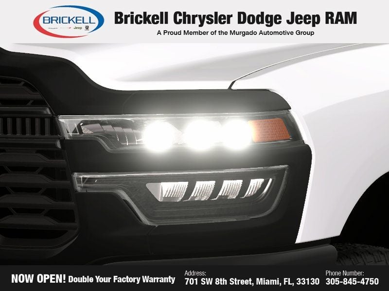 Price includes: $1000 - 2026 National Bonus Cash . Exp. 03/31/2026 $500 - 2026 National 2026 Military Bonus Cash . Exp. 01/04/2027 Discover Your Next Vehicle at Brickell Chrysler Dodge Jeep Ram Welcome to Brickell CDJR, where we go beyond selling cars. We double the factory powertrain warranty, giving you added peace of mind. Our dealership offers one of the largest new car inventories in the region, ensuring you find the right vehicle Prices displayed do not included our Perma-plate. Our state-of-the-art service department is the largest in the country and is open seven days a week from 7 AM to 9 PM. Visit us at 701 SW 8th St, Miami, FL 33130, or call 305-777-2800 to learn more and schedule a test drive. The displayed price includes an incentive for financing with Brickell CDJR Finance Company. Outside financing and bank drafts are not accepted. All pre-owned vehicle exports are subject to an export fee. Prices apply only to customers who live, work, or worship in Broward, Miami-Dade, Palm Beach, Monroe, Collier, Hendry, Lee, Glades, Martin, St. Lucie, Okeechobee, Manatee, Hillsborough, Osceola, or Orange County. Customers outside these counties will pay an additional $ Taxes, title, registration, and dealer fees apply. Factory MSRP: $69,995 Bright White Clearcoat 2026 Ram 2500 Tradesman 4WD 8-Speed Automatic 6.7L I6