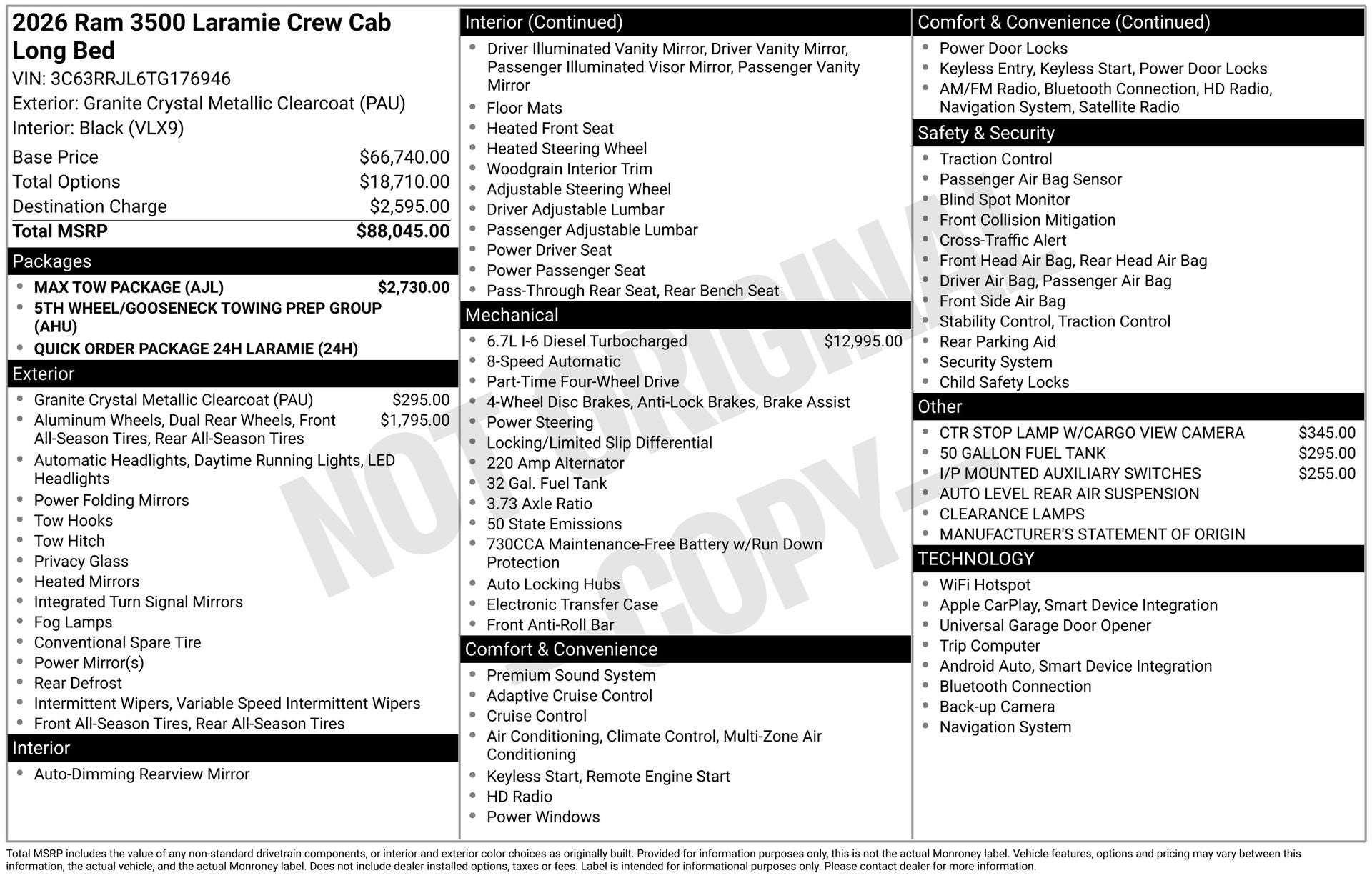 Price includes: $1000 - 2026 National Bonus Cash . Exp. 04/30/2026 Discover Your Next Vehicle at Brickell Chrysler Dodge Jeep Ram Welcome to Brickell CDJR, where we go beyond selling cars. We double the factory powertrain warranty, giving you added peace of mind. Our dealership offers one of the largest new car inventories in the region, ensuring you find the right vehicle Prices displayed do not included our Perma-plate. Our state-of-the-art service department is the largest in the country and is open seven days a week from 7 AM to 9 PM. Visit us at 701 SW 8th St, Miami, FL 33130, or call 305-777-2800 to learn more and schedule a test drive. The displayed price includes an incentive for financing with Brickell CDJR Finance Company. Outside financing and bank drafts are not accepted. All pre-owned vehicle exports are subject to an export fee. Prices apply only to customers who live, work, or worship in Broward, Miami-Dade, Palm Beach, Monroe, Collier, Hendry, Lee, Glades, Martin, St. Lucie, Okeechobee, Manatee, Hillsborough, Osceola, or Orange County. Customers outside these counties will pay an additional $ Taxes, title, registration, and dealer fees apply. Factory MSRP: $86,125 Granite Crystal Metallic Clearcoat 2026 Ram 3500 Laramie 4WD 8-Speed Automatic 6.7L I6