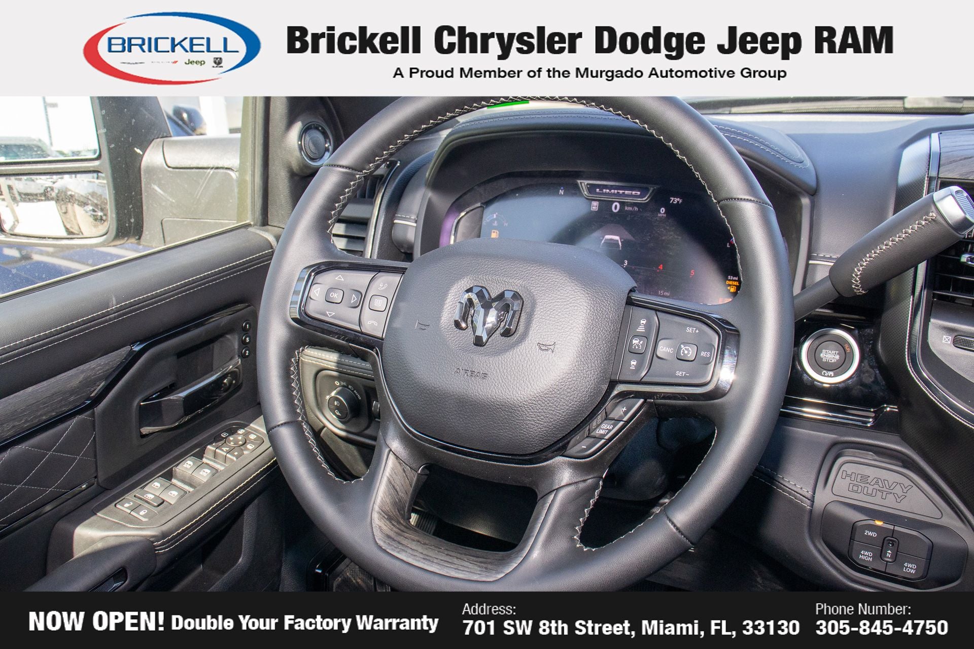 Price includes: $1000 - 2026 National Bonus Cash . Exp. 03/31/2026 Discover Your Next Vehicle at Brickell Chrysler Dodge Jeep Ram Welcome to Brickell CDJR, where we go beyond selling cars. We double the factory powertrain warranty, giving you added peace of mind. Our dealership offers one of the largest new car inventories in the region, ensuring you find the right vehicle Prices displayed do not included our Perma-plate. Our state-of-the-art service department is the largest in the country and is open seven days a week from 7 AM to 9 PM. Visit us at 701 SW 8th St, Miami, FL 33130, or call 305-777-2800 to learn more and schedule a test drive. The displayed price includes an incentive for financing with Brickell CDJR Finance Company. Outside financing and bank drafts are not accepted. All pre-owned vehicle exports are subject to an export fee. Prices apply only to customers who live, work, or worship in Broward, Miami-Dade, Palm Beach, Monroe, Collier, Hendry, Lee, Glades, Martin, St. Lucie, Okeechobee, Manatee, Hillsborough, Osceola, or Orange County. Customers outside these counties will pay an additional $ Taxes, title, registration, and dealer fees apply. Factory MSRP: $106,815 Diamond Black Crystal Pearlcoat 2026 Ram 3500 Limited 4WD 8-Speed Automatic 6.7L I6