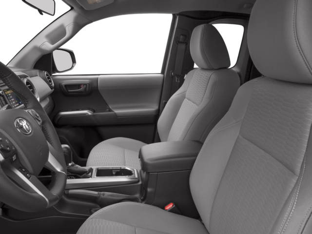 The Tacoma's interior offers a comfortable and well-appointed cabin, with features like a front center armrest, telescoping steering wheel, and premium fabric seat trim. The exterior showcases a sleek gray color, complemented by body-color bumpers and 16-inch steel wheels.