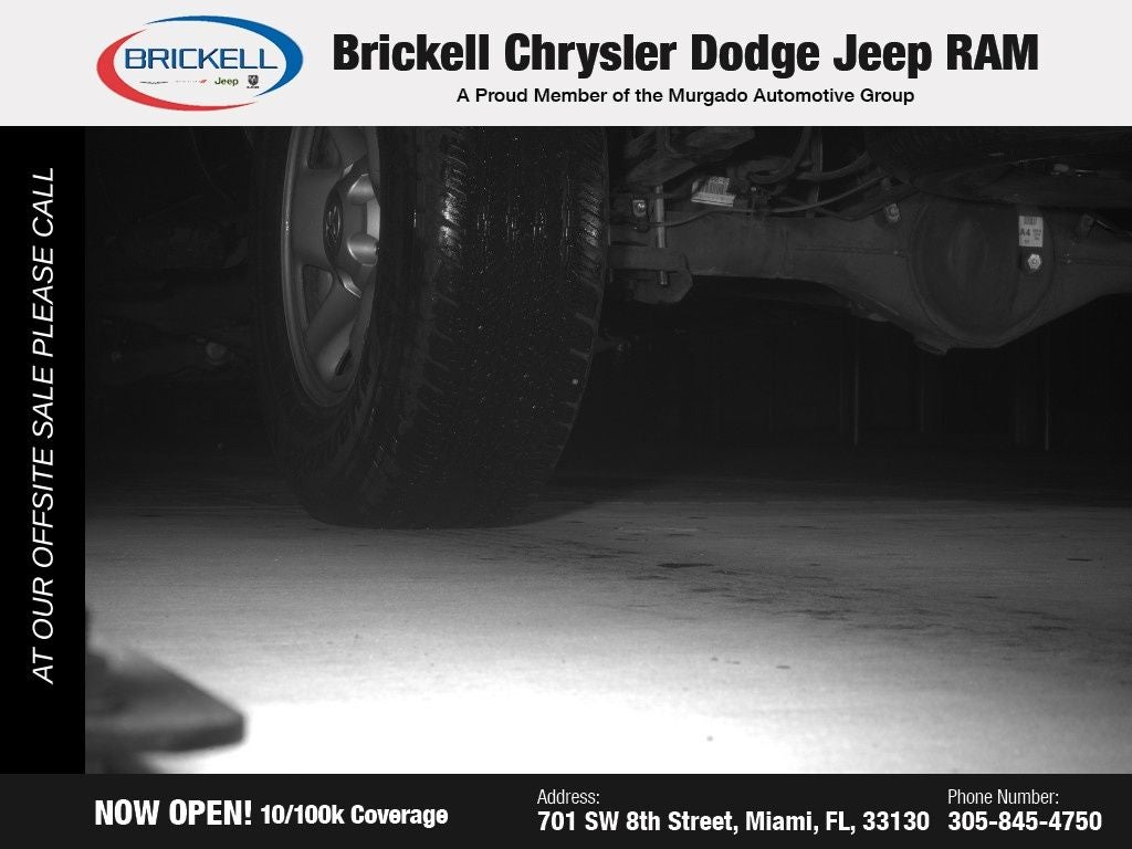 At Brickell CDJR, we make buying a pre-owned vehicle easy and stress-free. Every pre-owned vehicle is thoroughly inspected to ensure quality and reliability. For added confidence, we include a 10-year/100,000-mile powertrain warranty on all non-European brands at no additional cost. Our dealership offers one of the largest selections of pre-owned inventory in the region, so you can find the right car, truck, or SUV for your needs. Our state-of-the-art service department, the largest in the country, is open seven days a week from 7 AM to 9 PM, ensuring your vehicle stays in top condition. Visit us at 701 SW 8th St, Miami, FL 33130, or call 305-777-2800 to learn more and schedule a test drive. The displayed price includes an incentive for financing with Brickell CDJR Finance Company. Price does not included our Perma-Plate .Outside financing and bank drafts are not accepted. All pre-owned vehicle exports are subject to an export fee. Taxes, title, registration, and dealer fees apply.