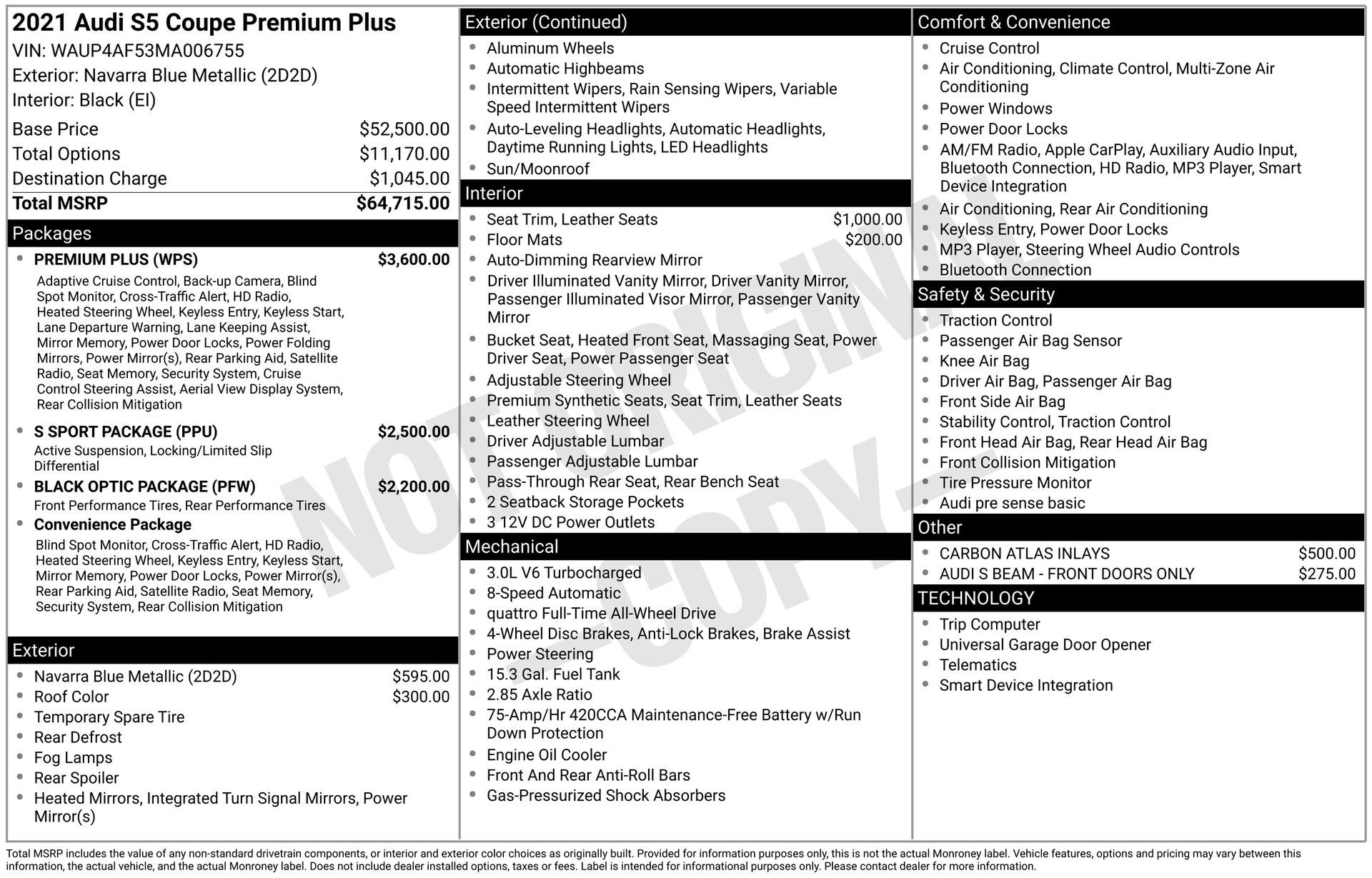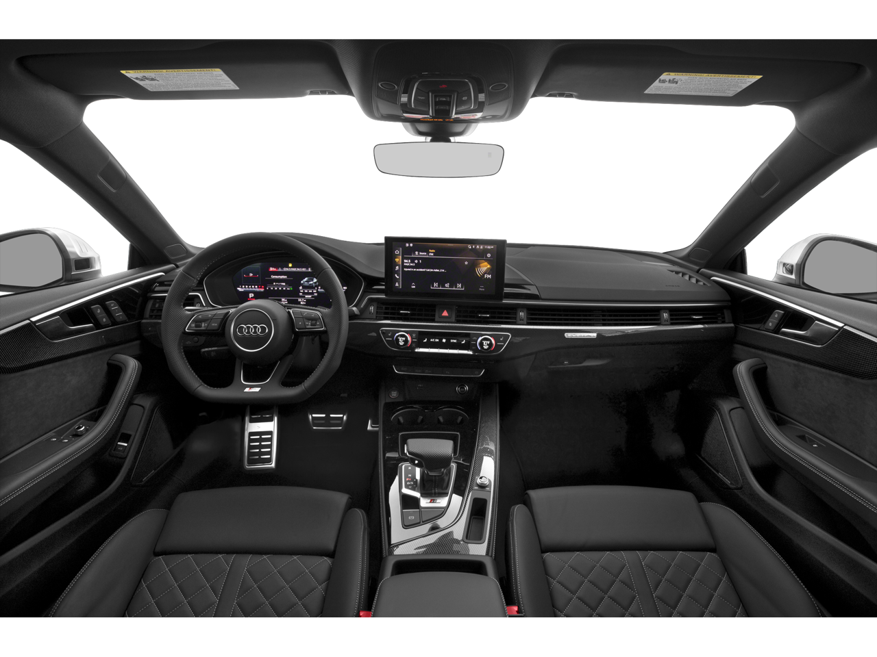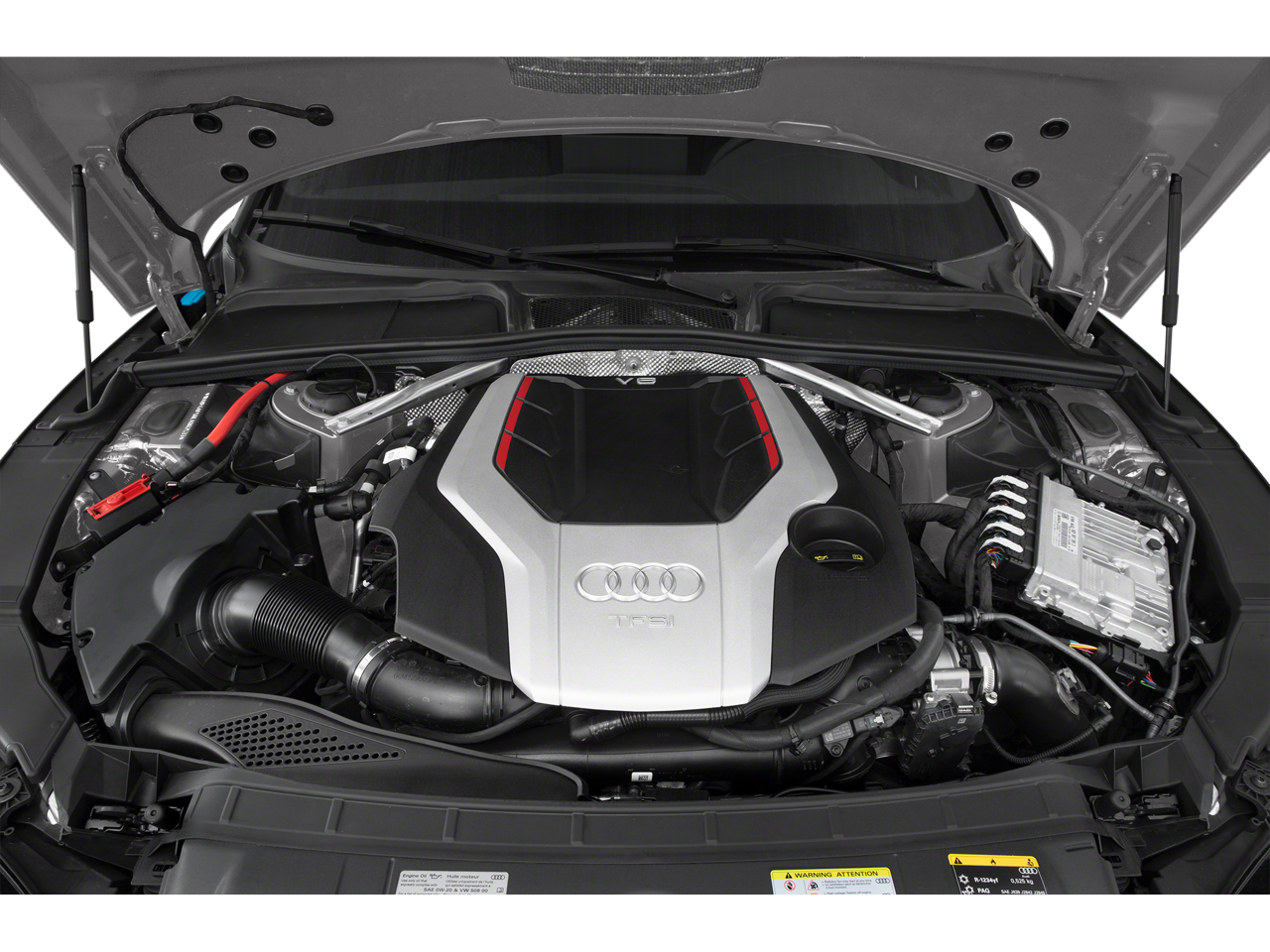 10 Speakers, 4-Wheel Disc Brakes, ABS brakes, Adaptive Cruise Control w/Traffic Jam Assist, Air Conditioning, Alarm System w/Motion Sensors, Alloy wheels, AM/FM radio, Audi Active Lane Assist, Audi Advanced Key, Audi S Beam - Front Doors Only, Audi Side Assist w/Pre Sense Rear, Audi smartphone interface with Apple CarPlay, Auto High-beam Headlights, Auto-Dimming Exterior Mirrors, Auto-dimming Rear-View mirror, Automatic temperature control, Black Exterior Trim, Black Optic Package, Black Roof, Brake assist, Bumpers: body-color, Carbon Atlas Inlays, Compass, Convenience Package, Delay-off headlights, Driver door bin, Driver Seat Memory, Driver vanity mirror, Dual front impact airbags, Dual front side impact airbags, Electronic Stability Control, Emergency communication system: Audi connect CARE, Exterior Parking Camera Rear, Four wheel independent suspension, Front & Rear Red Brake Calipers, Front anti-roll bar, Front Bucket Seats, Front Center Armrest, Front dual zone A/C, Front fog lights, Front reading lights, Garage door transmitter: HomeLink, Hands-On Detection Steering Wheel, Heated door mirrors, Heated Front S Sport Seats, Heated front seats, Heated Steering Wheel, High-Gloss Black Exterior Mirror Housings, Illuminated entry, Knee airbag, Leather Shift Knob, Leather steering wheel, Leather/Alcantara Seating Surfaces, Low tire pressure warning, Occupant sensing airbag, Outside temperature display, Overhead airbag, Overhead console, Panic alarm, Parking System Plus (Front/Rear Acoustic Sensors), Passenger door bin, Passenger vanity mirror, Power door mirrors, Power driver seat, Power Folding Exterior Mirrors, Power moonroof, Power passenger seat, Power steering, Power windows, Premium Plus, Radio data system, Radio: Audi Sound System, Rain sensing wipers, Rear air conditioning, Rear anti-roll bar, Rear reading lights, Rear seat center armrest, Rear window defroster, Remote keyless entry, S Sport Package, S5 Logo Audi Guard All-Weather Floor Mats, SiriusXM All Access Service, Speed control, Speed-sensing steering, Speed-Sensitive Wipers, Split folding rear seat, Spoiler, Sport Adaptive Damping Suspension, Sport Rear Differential, Steering wheel mounted audio controls, Tachometer, Telescoping steering wheel, Tilt steering wheel, Top View Camera System, Traction control, Trip computer, Turn signal indicator mirrors, Variably intermittent wipers, Wheels: 18 5-Double-Spoke Design, Wheels: 20 5-Twin-Spoke Polygon Design.