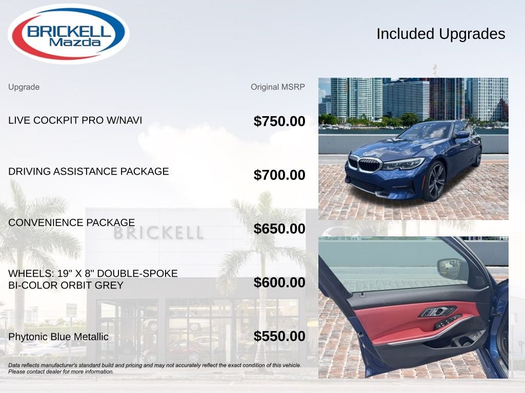 2022 BMW 3 Series 330i 330i Dealership Brickell Mazda. Phytonic Blue Metallic 2.0L 4-Cylinder DOHC 16V Turbocharged 8-Speed Automatic Sport 26/36 City/Highway MPG RWD