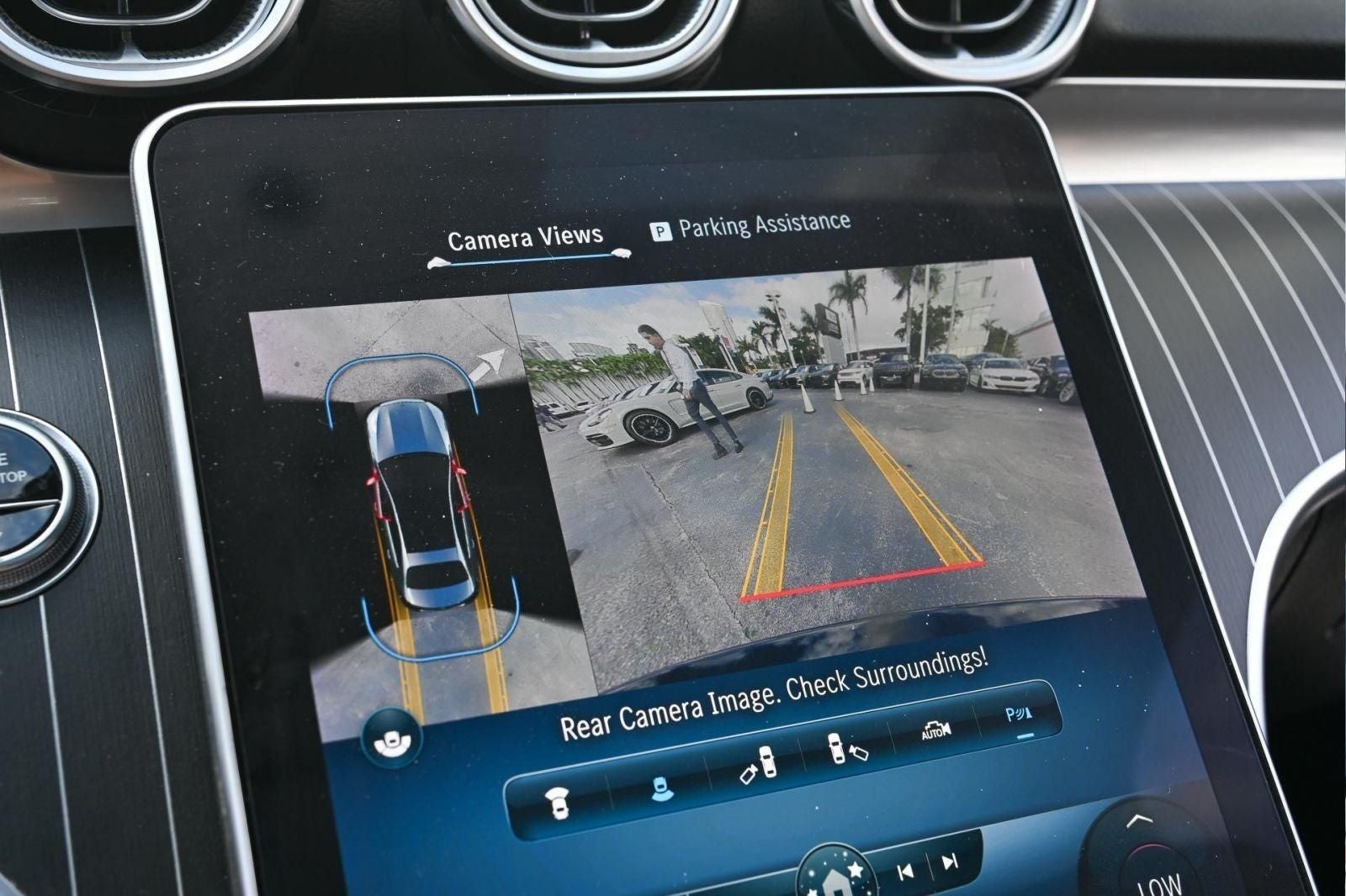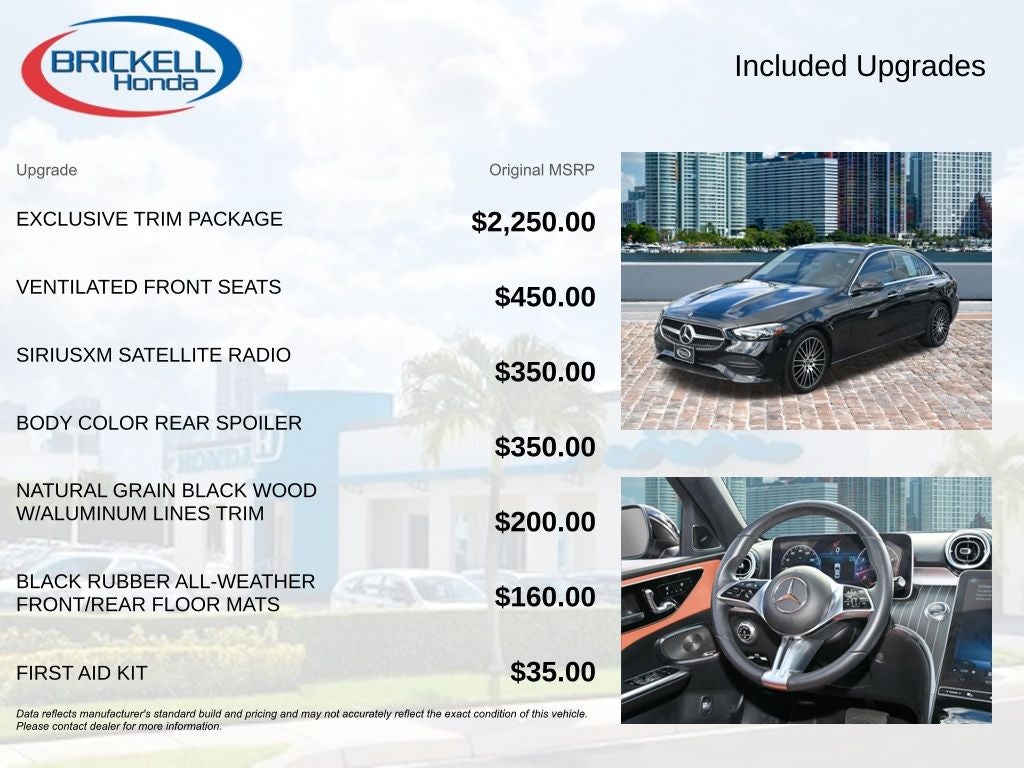 C 300, 4D Sedan, 2.0L I4 Turbocharged, 9-Speed Automatic, RWD, Black Leatherette, 11.9 Center Touchscreen Display, 18 5-Spoke Wheels, 4-way Power Driver's Lumbar Support, 4-Wheel Disc Brakes, 5 Speakers, ABS brakes, Air Conditioning, Alloy wheels, AM/FM radio, Anti-whiplash front head restraints, Apple CarPlay®/Android Auto®, Auto High-beam Headlights, Auto tilt-away steering wheel, Auto-dimming door mirrors, Auto-dimming Rear-View mirror, Automatic temperature control, Brake assist, Bumpers: body-color, Child-Seat-Sensing Airbag, Compass, Delay-off headlights, Driver door bin, Driver vanity mirror, Dual front impact airbags, Dual front side impact airbags, Electronic Stability Control, Emergency communication system: Mercedes-Benz Emergency Call Service, Exterior Parking Camera Rear, Four wheel independent suspension, Front anti-roll bar, Front Bucket Seats, Front Center Armrest, Front dual zone A/C, Front reading lights, Fully automatic headlights, Garage door transmitter: HomeLink, Genuine wood dashboard insert, Head restraints memory, Heated door mirrors, Heated front seats, Illuminated entry, Knee airbag, Low tire pressure warning, MB-Tex Upholstery, Memory seat, Occupant sensing airbag, Outside temperature display, Overhead airbag, Overhead console, Panic alarm, Passenger door bin, Passenger vanity mirror, Power adjustable front head restraints, Power door mirrors, Power driver seat, Power Heated Front Seats w/Memory, Power moonroof, Power passenger seat, Power steering, Power windows, Premium audio system: MBUX, Premium Trim Package, Radio data system, Radio: FrontBass 5-Speaker Audio System, Rain sensing wipers, Rear anti-roll bar, Rear fog lights, Rear reading lights, Rear seat center armrest, Rear window defroster, Remote keyless entry, Security system, Speed control, Speed-sensing steering, Split folding rear seat, Steering wheel memory, Steering wheel mounted audio controls, Tachometer, Telescoping steering wheel, Tilt steering wheel, Traction control, Trip computer, Turn signal indicator mirrors, Variably intermittent wipers, Weather band radio, C 300, 4D Sedan, 2.0L I4 Turbocharged, 9-Speed Automatic, RWD, Black Leatherette.