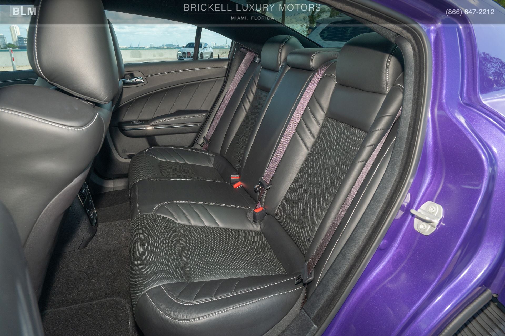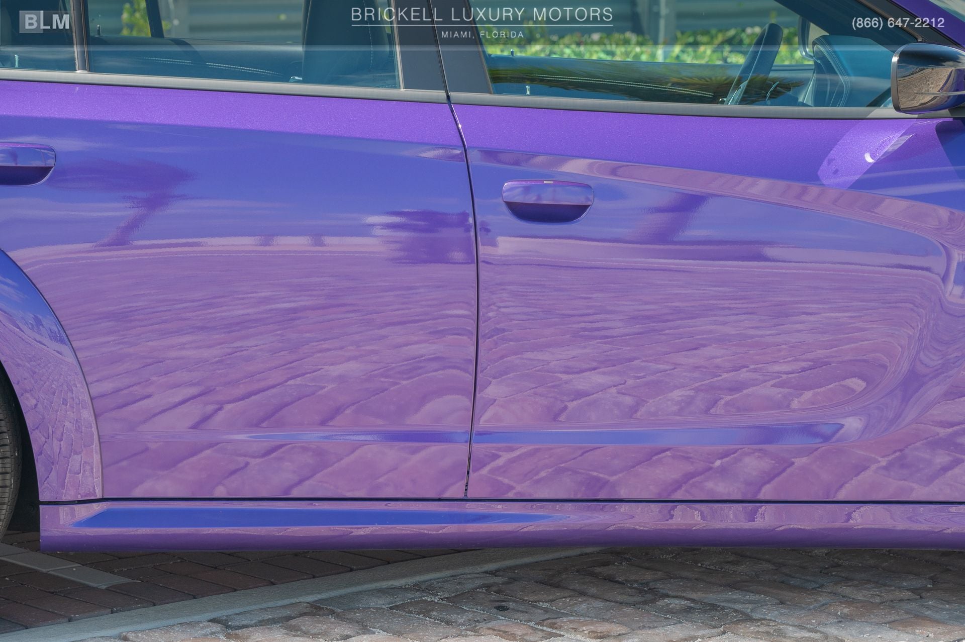 The Charger Hellcat Widebody's striking exterior is more than just a pretty face. The wide-body design and aggressive styling cues, including the black exterior badging and dual bright exhaust tips, command attention on the road. And with the Plum Crazy Pearlcoat paint, this Charger is sure to turn heads wherever it goes.