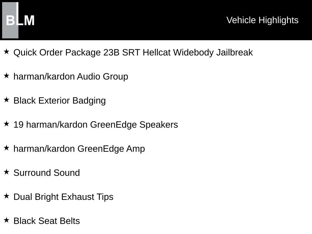 - Quick Order Package 23B SRT Hellcat Widebody Jailbreak with Bright Charger Badge, Dual Bright Exhaust Tips, Black Seat Belts, and Jailbreak IP Badge