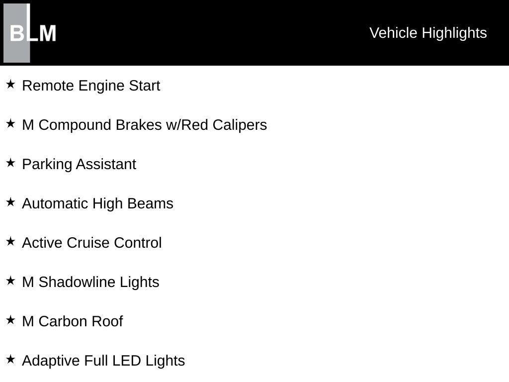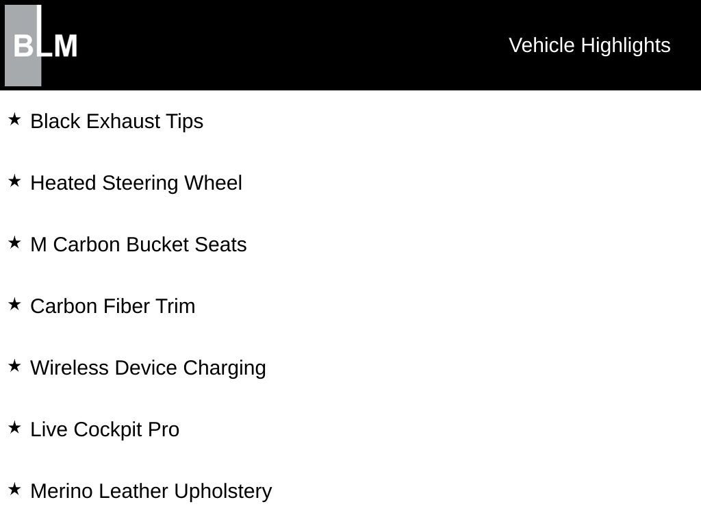 Slip into the luxurious Merino Leather seats and experience the unparalleled craftsmanship of the M Carbon Bucket Seats. The Shadowline Package and Carbon Fiber Trim lend an air of sophistication, while the Active Cruise Control and Parking Assistant make every drive a pleasure.