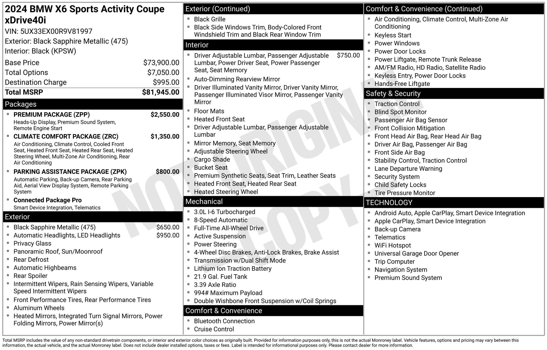 X6 xDrive40i, 4D Sport Utility, 3.0L DOHC 24V, 8-Speed Automatic Sport, AWD, Black Leather, 10 Speakers, 3.39 Axle Ratio, 4-Wheel Disc Brakes, ABS brakes, Adaptive suspension, Air Conditioning, Alloy wheels, AM/FM radio: SiriusXM with 360L, AM/FM Stereo, Apple CarPlay & Android Auto Compatibility, Apple CarPlay Compatibility, Auto High-beam Headlights, Auto tilt-away steering wheel, Auto-dimming door mirrors, Auto-dimming Rear-View mirror, Automatic temperature control, BMW Assist eCall, BMW TeleServices, Brake assist, Bumpers: body-color, Compass, Connected Package Pro, ConnectedDrive Services, Delay-off headlights, Digital Cockpit Plus, Driver door bin, Driver vanity mirror, Dual front impact airbags, Dual front side impact airbags, Electronic Stability Control, Emergency communication system: BMW Assist eCall, Exterior Parking Camera Rear, Four wheel independent suspension, Front anti-roll bar, Front Bucket Seats, Front Center Armrest, Front dual zone A/C, Front reading lights, Fully automatic headlights, Garage door transmitter, Genuine wood console insert, Genuine wood door panel insert, Head restraints memory, Heated door mirrors, Heated Front Seats, Heated front seats, Hi-Fi Sound System, Illuminated entry, Leather steering wheel, Low tire pressure warning, Lumbar Support, Memory seat, Navigation System, Occupant sensing airbag, Outside temperature display, Overhead airbag, Overhead console, Panic alarm, Passenger door bin, Passenger vanity mirror, Personal eSIM 5G, Power adjustable front head restraints, Power door mirrors, Power driver seat, Power Front Seats, Power Liftgate, Power moonroof, Power passenger seat, Power steering, Power windows, Radio data system, Rain sensing wipers, Rear anti-roll bar, Rear reading lights, Rear seat center armrest, Rear window defroster, Remote keyless entry, Security system, Sensafin Upholstery, SiriusXM w/360L & 1 Year Platinum Plan Subscription, Speed control, Speed-sensing steering, Speed-Sensitive Wipers, Split folding rear seat, Spoiler, Sport Seats, Sport steering wheel, Steering wheel memory, Steering wheel mounted A/C controls, Steering wheel mounted audio controls, Tachometer, Telescoping steering wheel, Tilt steering wheel, Traction control, Trip computer, Turn signal indicator mirrors, Variably intermittent wipers, Wheels: 20 x 9 M Star-Spoke Bi-Color (Style 740M), Wireless Device Charging, X6 xDrive40i, 4D Sport Utility, 3.0L DOHC 24V, 8-Speed Automatic Sport, AWD, Black Leather.