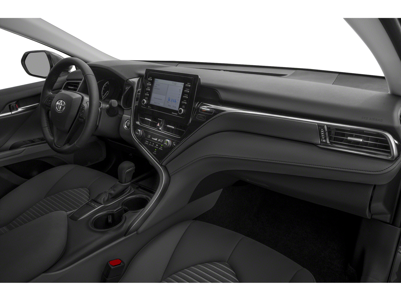 Camry SE, 4D Sedan, 2.5L I4 DOHC 16V, 8-Speed Automatic, FWD, Predawn Gray Mica, Black w/Sport SofTex Seat Trim w/Fabric Inserts, 18 x 8J Alloy Wheels, 4-Wheel Disc Brakes, 6 Speakers, ABS brakes, Air Conditioning, Alloy wheels, AM/FM radio: SiriusXM, Apple CarPlay/Android Auto, Auto High-beam Headlights, Automatic temperature control, Brake assist, Bumpers: body-color, Delay-off headlights, Driver door bin, Driver vanity mirror, Dual front impact airbags, Dual front side impact airbags, Electronic Stability Control, Emergency communication system: Safety Connect (1-year trial), Exterior Parking Camera Rear, Four wheel independent suspension, Front anti-roll bar, Front Bucket Seats, Front Center Armrest, Front dual zone A/C, Front reading lights, Fully automatic headlights, Heated door mirrors, Illuminated entry, Knee airbag, Leather steering wheel, Low tire pressure warning, Occupant sensing airbag, Outside temperature display, Overhead airbag, Overhead console, Panic alarm, Passenger door bin, Passenger vanity mirror, Power door mirrors, Power driver seat, Power steering, Power windows, Radio data system, Radio: Audio, Rear anti-roll bar, Rear seat center armrest, Rear side impact airbag, Rear window defroster, Remote keyless entry, Security system, Speed control, Speed-sensing steering, Split folding rear seat, Spoiler, Sport SofTex Seat Trim w/Fabric Inserts, Steering wheel mounted audio controls, Tachometer, Telescoping steering wheel, Tilt steering wheel, Traction control, Trip computer, Turn signal indicator mirrors, Variably intermittent wipers, Camry SE, 4D Sedan, 2.5L I4 DOHC 16V, 8-Speed Automatic, FWD, Predawn Gray Mica, Black w/Sport SofTex Seat Trim w/Fabric Inserts.