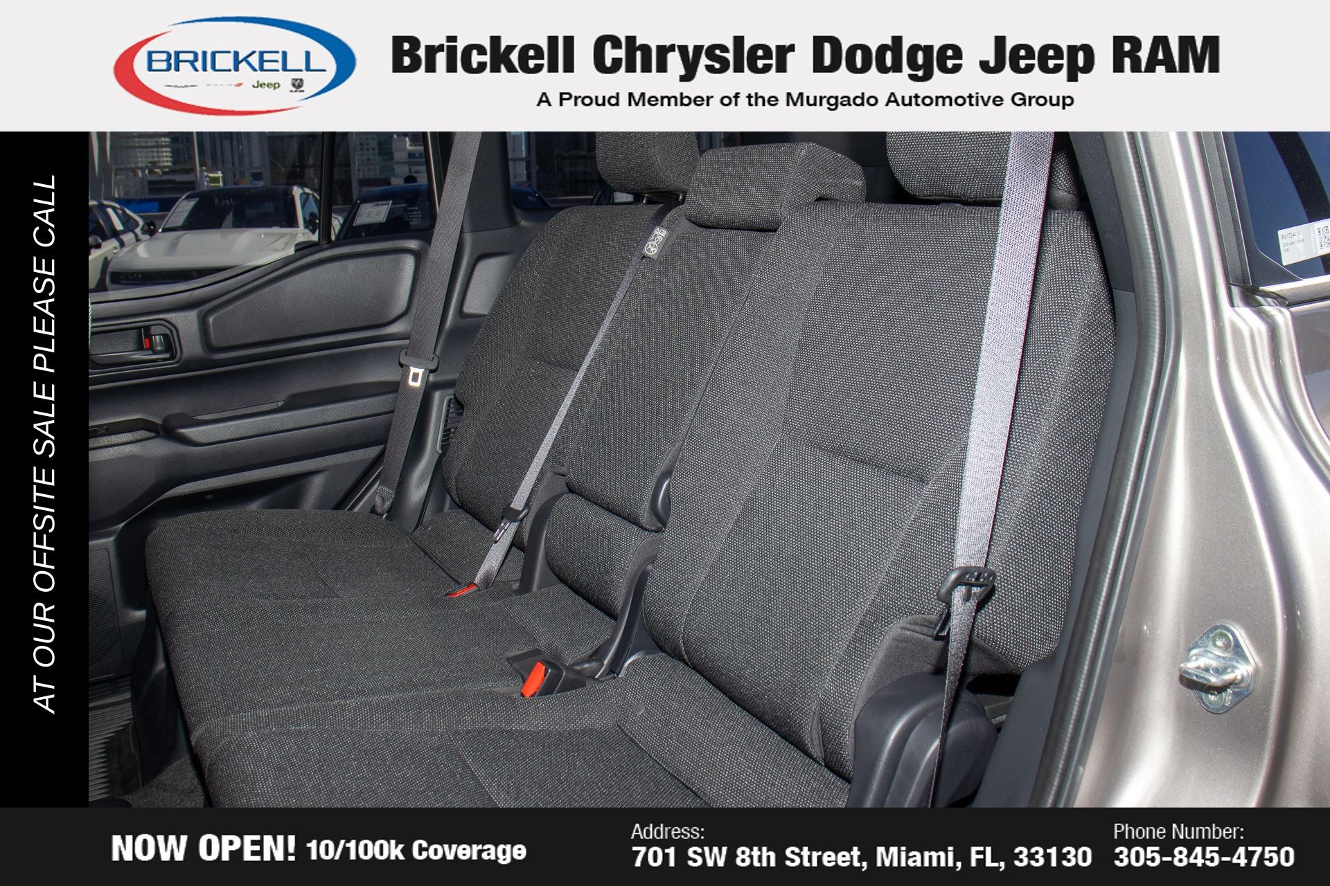 At Brickell CDJR, we make buying a pre-owned vehicle easy and stress-free. Every pre-owned vehicle is thoroughly inspected to ensure quality and reliability. For added confidence, we include a **10-year/100,000-mile powertrain warranty on all non-European brands** at no additional cost. Our dealership offers one of the largest selections of pre-owned inventory in the region, so you can find the right car, truck, or SUV for your needs. Our state-of-the-art service department, the largest in the country, is open seven days a week from 7 AM to 9 PM, ensuring your vehicle stays in top condition. Visit us at 701 SW 8th St, Miami, FL 33130, or call 305-777-2800 to learn more and schedule a test drive. The displayed price includes an incentive for financing with Brickell CDJR Finance Company. Price does not included our Perma-Plate .Outside financing and bank drafts are not accepted. All pre-owned vehicle exports are subject to an export fee. Taxes, title, registration, and dealer fees apply.