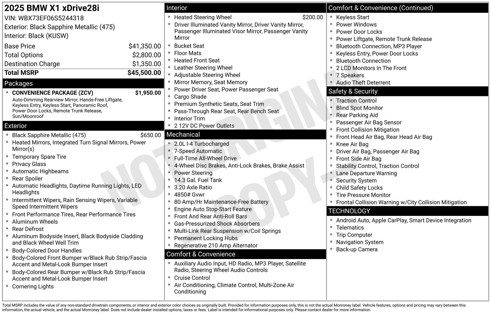 X1 xDrive28i, 4D Sport Utility, 2.0L I4 16V TwinPower Turbo, 7-Speed Automatic, AWD, Black Sapphire Metallic, Black w/Perforated Veganza Upholstery, 4-Wheel Disc Brakes, 7 Speakers, ABS brakes, Air Conditioning, Alloy wheels, AM/FM Radio, AM/FM radio: SiriusXM with 360L, Apple CarPlay and Android Auto Compatibility, Apple CarPlay Compatibility, Auto High-beam Headlights, Automatic temperature control, BMW Assist ECall, BMW TeleServices, Brake assist, Bumpers: body-color, Compass, Delay-off headlights, Driver door bin, Driver vanity mirror, Dual front impact airbags, Dual front side impact airbags, Electronic Stability Control, Emergency communication system: BMW Assist eCall, Exterior Parking Camera Rear, Four wheel independent suspension, Front anti-roll bar, Front Bucket Seats, Front Center Armrest w/Storage, Front dual zone A/C, Front reading lights, Heated door mirrors, Heated Front Seats, Heated front seats, Illuminated entry, Knee airbag, Leather steering wheel, Low tire pressure warning, Memory seat, Navigation, Navigation System, Occupant sensing airbag, Outside temperature display, Overhead airbag, Overhead console, Panic alarm, Passenger door bin, Passenger vanity mirror, Perforated Veganza Upholstery, Personal ESIM 5G, Power door mirrors, Power driver seat, Power Front Seats, Power Liftgate, Power passenger seat, Power steering, Power windows, Radio data system, Rain sensing wipers, Rear anti-roll bar, Rear reading lights, Rear seat center armrest, Rear window defroster, Rear window wiper, Remote keyless entry, Security system, SiriusXM with 360L and 1 Year Platinum Plan Subscription, Speed control, Speed-sensing steering, Speed-Sensitive Wipers, Split folding rear seat, Spoiler, Steering wheel mounted audio controls, Tachometer, Telescoping steering wheel, Tilt steering wheel, Traction control, Trip computer, Turn signal indicator mirrors, Variably intermittent wipers, Wheels: 18 x 7.5 V-Spoke Bi-Color, Widescreen Display, X1 xDrive28i, 4D Sport Utility, 2.0L I4 16V TwinPower Turbo, 7-Speed Automatic, AWD, Black Sapphire Metallic, Black w/Perforated Veganza Upholstery.