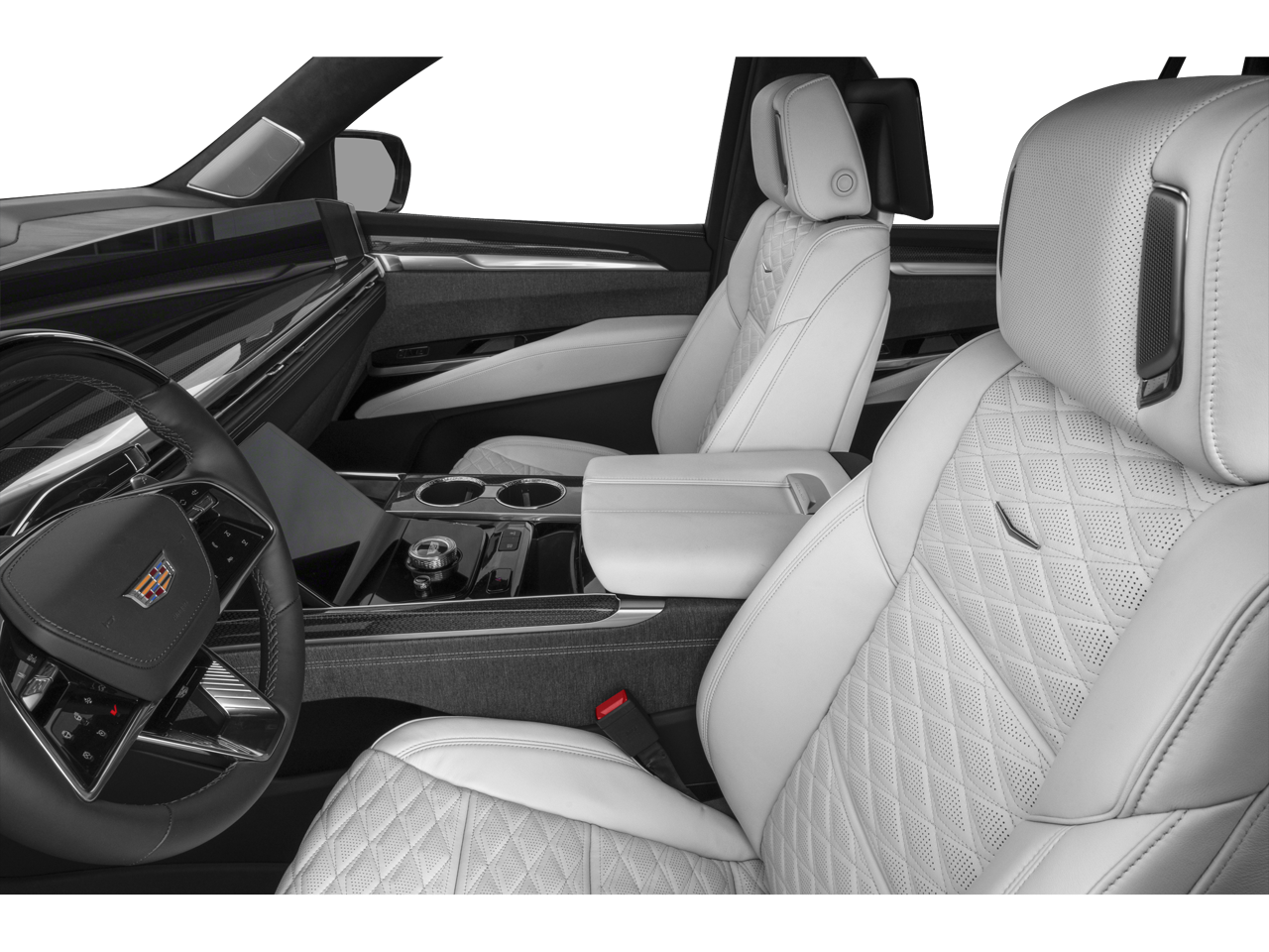 The interior of this Escalade V-Series is a true sanctuary of luxury and refinement. The spacious cabin is adorned with premium materials, including genuine wood accents and full semi-aniline leather seating. The AKG Studio Reference 36-Speaker Audio System provides an immersive listening experience, while the Reconfigurable Full-Color Head-Up Display keeps crucial information within your line of sight.