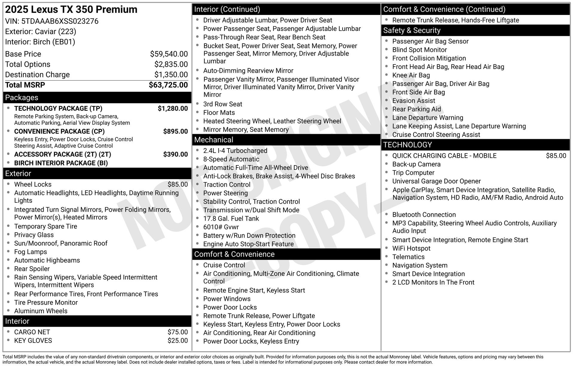 TX 350, 4D Sport Utility, 2.4L I4 Turbocharged, 8-Speed Automatic, AWD, Caviar, Black w/NuLuxe Seat Trim, 12 Speakers, 3rd row seats: split-bench, 4-Wheel Disc Brakes, ABS brakes, Air Conditioning, Alloy wheels, AM/FM radio, Auto High-beam Headlights, Auto tilt-away steering wheel, Auto-dimming door mirrors, Auto-dimming Rear-View mirror, Automatic temperature control, Brake assist, Bumpers: body-color, Delay-off headlights, Driver door bin, Driver vanity mirror, Dual front impact airbags, Dual front side impact airbags, Electronic Stability Control, Emergency communication system: Safety Connect (10-year trial), Exterior Parking Camera Rear, Four wheel independent suspension, Front anti-roll bar, Front Bucket Seats, Front Center Armrest, Front dual zone A/C, Front fog lights, Front reading lights, Fully automatic headlights, Garage door transmitter: HomeLink, Heated door mirrors, Heated Front Seats, Heated front seats, Heated steering wheel, Illuminated entry, Knee airbag, Leather Shift Knob, Leather steering wheel, Low tire pressure warning, Navigation system: Drive Connect Cloud Navigation (3-year trial subscription included), NuLuxe Seat Trim, Occupant sensing airbag, Outside temperature display, Overhead airbag, Panic alarm, Passenger door bin, Passenger vanity mirror, Power door mirrors, Power driver seat, Power Liftgate, Power passenger seat, Power steering, Power windows, Radio data system, Radio: Lexus Interface, Rain sensing wipers, Rear air conditioning, Rear anti-roll bar, Rear reading lights, Rear seat center armrest, Rear window defroster, Rear window wiper, Reclining 3rd row seat, Remote keyless entry, Security system, Speed control, Speed-sensing steering, Split folding rear seat, Spoiler, Steering wheel mounted audio controls, Tachometer, Telescoping steering wheel, Tilt steering wheel, Traction control, Trip computer, Turn signal indicator mirrors, Variably intermittent wipers, Wheels: 20 Multi-Spoke Alloy, Wireless Apple CarPlay/Wireless Android Auto, TX 350, 4D Sport Utility, 2.4L I4 Turbocharged, 8-Speed Automatic, AWD, Caviar, Black w/NuLuxe Seat Trim.