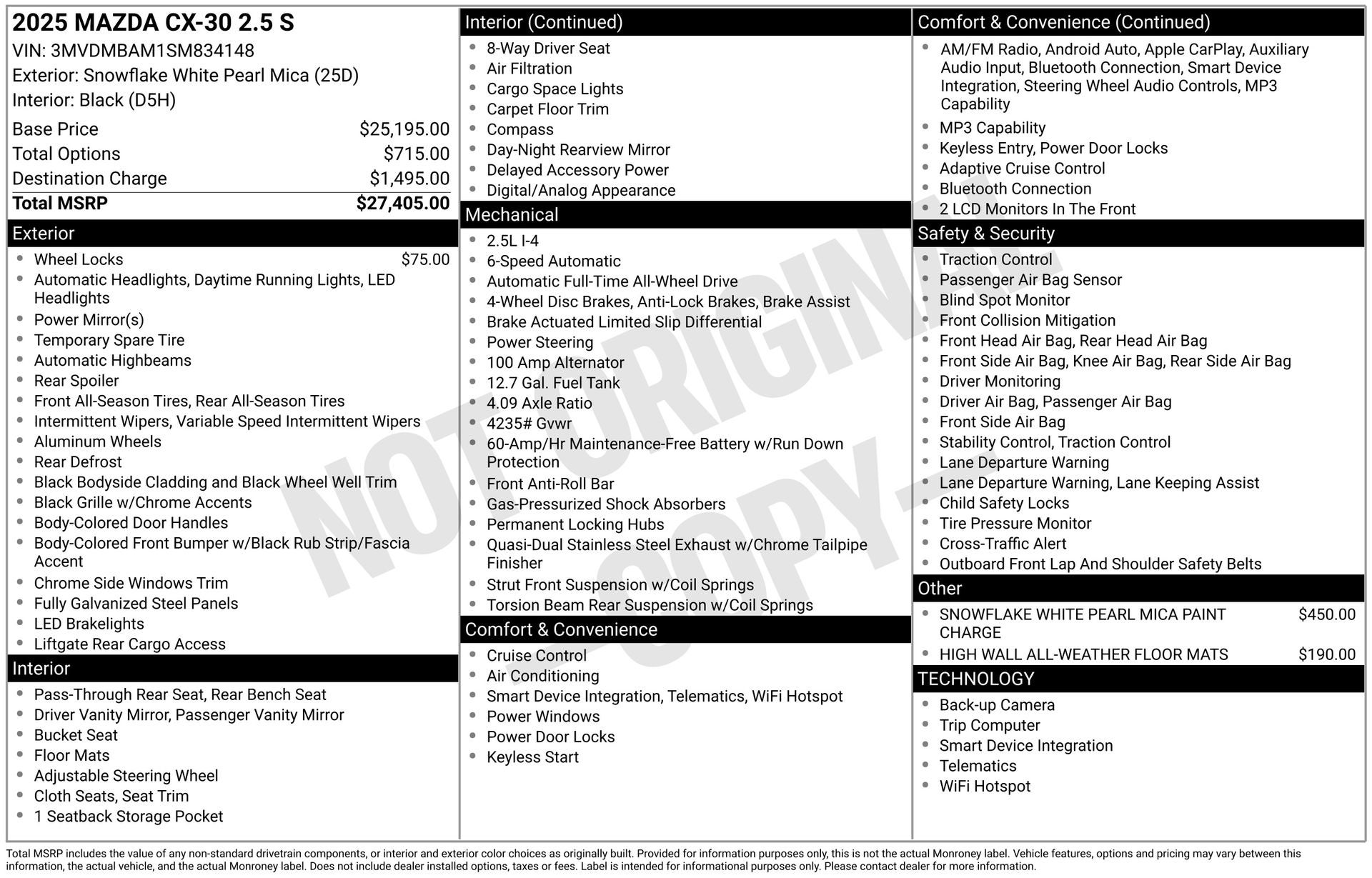 Boasting a sleek and sophisticated exterior, the CX-30 2.5 S commands attention on the road. Its SKYACTIV® 2.5L 4-Cylinder DOHC 16V engine delivers a thrilling 26 city / 33 highway MPG, ensuring you can conquer your daily commute or weekend adventures with ease. The available all-wheel-drive system provides confident handling in all conditions, making this Mazda a true year-round companion.
