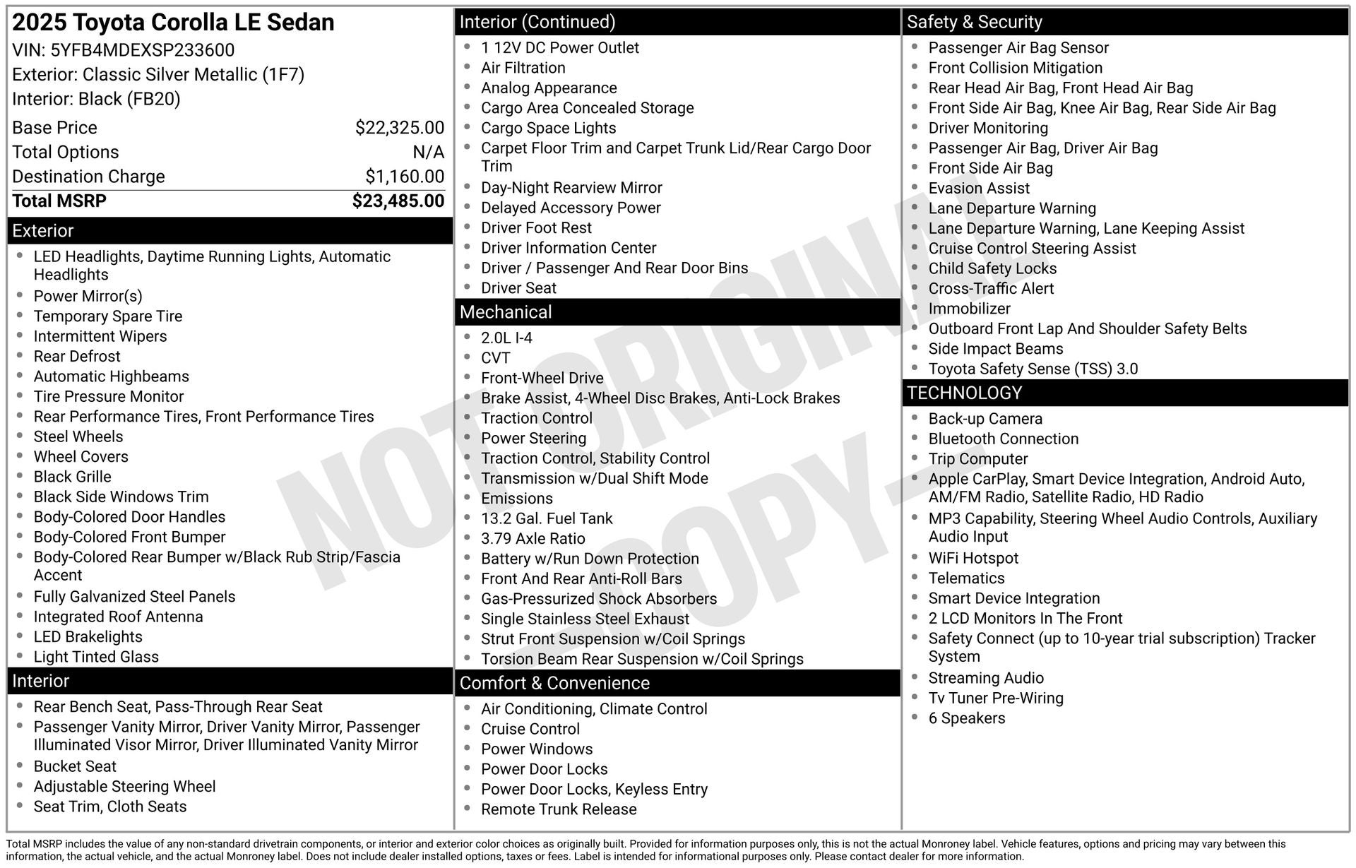 Corolla LE, 4D Sedan, 2.0L I4 DOHC 16V, CVT, FWD, Black Cloth, 4-Wheel Disc Brakes, 6 Speakers, ABS brakes, Air Conditioning, AM/FM radio: SiriusXM, Apple CarPlay/Android Auto, Auto High-beam Headlights, Automatic temperature control, Brake assist, Bumpers: body-color, Delay-off headlights, Driver door bin, Driver vanity mirror, Dual front impact airbags, Dual front side impact airbags, Electronic Stability Control, Emergency communication system: Safety Connect (up to 10-year trial subscription), Exterior Parking Camera Rear, Fabric Seat Trim, Front anti-roll bar, Front Bucket Seats, Front Center Armrest, Front reading lights, Front wheel independent suspension, Fully automatic headlights, Illuminated entry, Knee airbag, Low tire pressure warning, Occupant sensing airbag, Outside temperature display, Overhead airbag, Panic alarm, Passenger door bin, Passenger vanity mirror, Power door mirrors, Power steering, Power windows, Radio data system, Radio: 8 Toyota Audio Multimedia, Rear anti-roll bar, Rear seat center armrest, Rear side impact airbag, Rear window defroster, Remote keyless entry, Speed control, Split folding rear seat, Steering wheel mounted audio controls, Tachometer, Telescoping steering wheel, Tilt steering wheel, Traction control, Trip computer, Wheels: 16 Steel with Covers, Corolla LE, 4D Sedan, 2.0L I4 DOHC 16V, CVT, FWD, Black Cloth.
