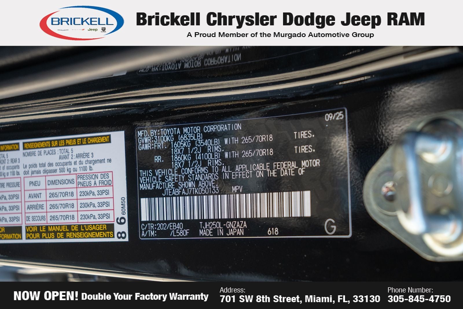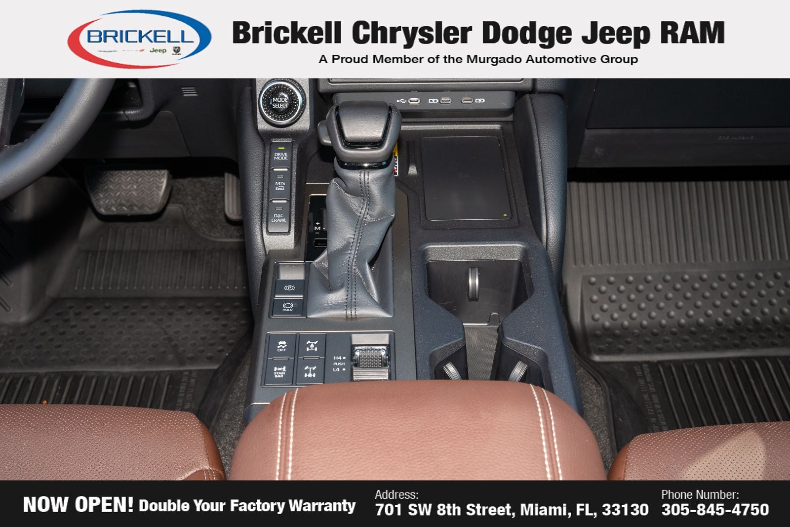At Brickell CDJR, we make buying a pre-owned vehicle easy and stress-free. Every pre-owned vehicle is thoroughly inspected to ensure quality and reliability. For added confidence, we include a **10-year/100,000-mile powertrain warranty on all non-European brands** at no additional cost. Our dealership offers one of the largest selections of pre-owned inventory in the region, so you can find the right car, truck, or SUV for your needs. Our state-of-the-art service department, the largest in the country, is open seven days a week from 7 AM to 9 PM, ensuring your vehicle stays in top condition. Visit us at 701 SW 8th St, Miami, FL 33130, or call 305-777-2800 to learn more and schedule a test drive. The displayed price includes an incentive for financing with Brickell CDJR Finance Company. Price does not included our Perma-Plate .Outside financing and bank drafts are not accepted. All pre-owned vehicle exports are subject to an export fee. Taxes, title, registration, and dealer fees apply.